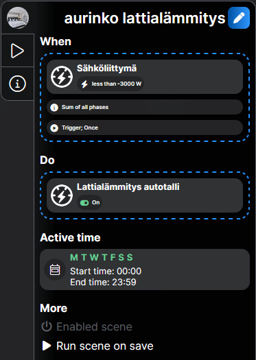 Aurinkosähkön ohjaaminen ja pörssisähköohjaus vaativat perehtymistä aiheeseen. Voit Shelly Appin kautta luoda sännöt liittymän sen hetkisen kulutuksen/myynnin perusteella, kun olet liittänyt laitteet Shelly.Cloud pilvipalveluun. Shelly laitteita on mahdollista ohjata myös ulkopuolisten palveluiden tai valmiiden scriptien avulla pörssisähkön, tai tarkemman aurinkosähkön tuoton mukaan.